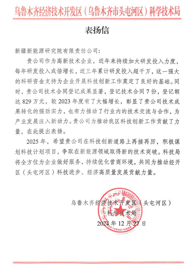 新疆新能源研究院獲烏魯木齊市經(jīng)濟(jì)技術(shù)開發(fā)區(qū)(頭屯河區(qū))科學(xué)技術(shù)局表揚(yáng)信