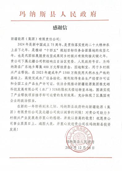 近日,集團(tuán)收到瑪納斯縣政府感謝信,對(duì)所屬北疆公司在助力當(dāng)?shù)剜l(xiāng)村振興產(chǎn)業(yè)幫扶工作上致以感謝。
